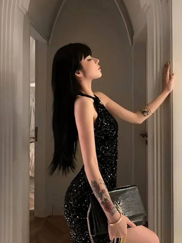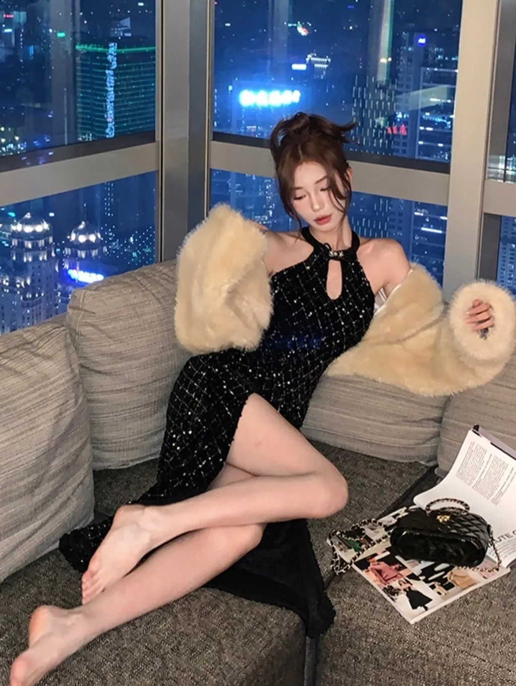 Charming Mermaid Halter Black Sequin Long Slit Prom Dress HZ1024