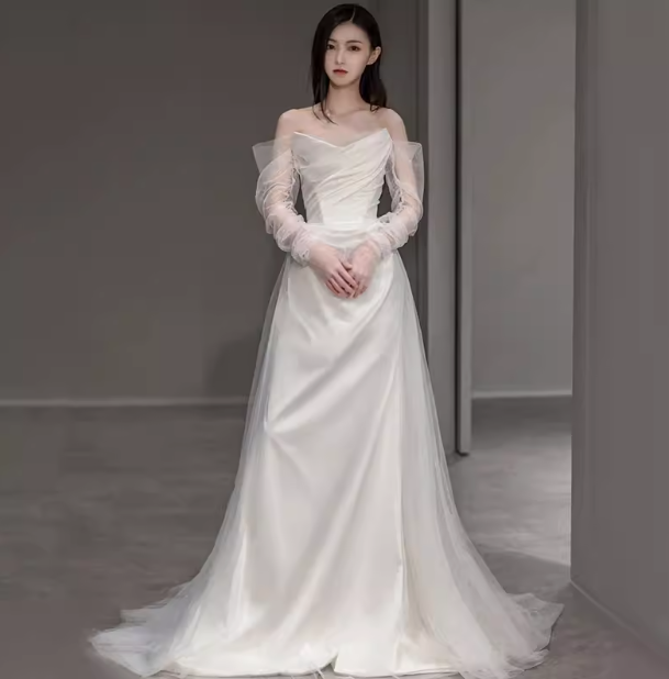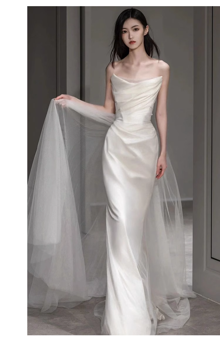 Chic A line Strapless Satin Long Wedding Dresses With Ruffles HZ1024
