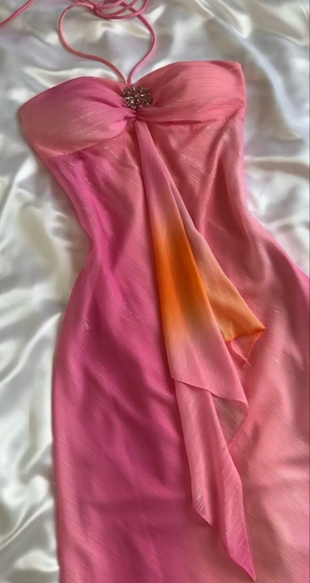 Elegant A line Halter Chiffon Ombre Pink Prom Dresses Evening Dress With Beads HZ1024