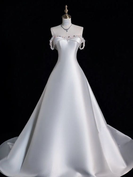 Elegant A line Off The Shoulder Satin Pearls Long White Wedding Dresses HZ1024