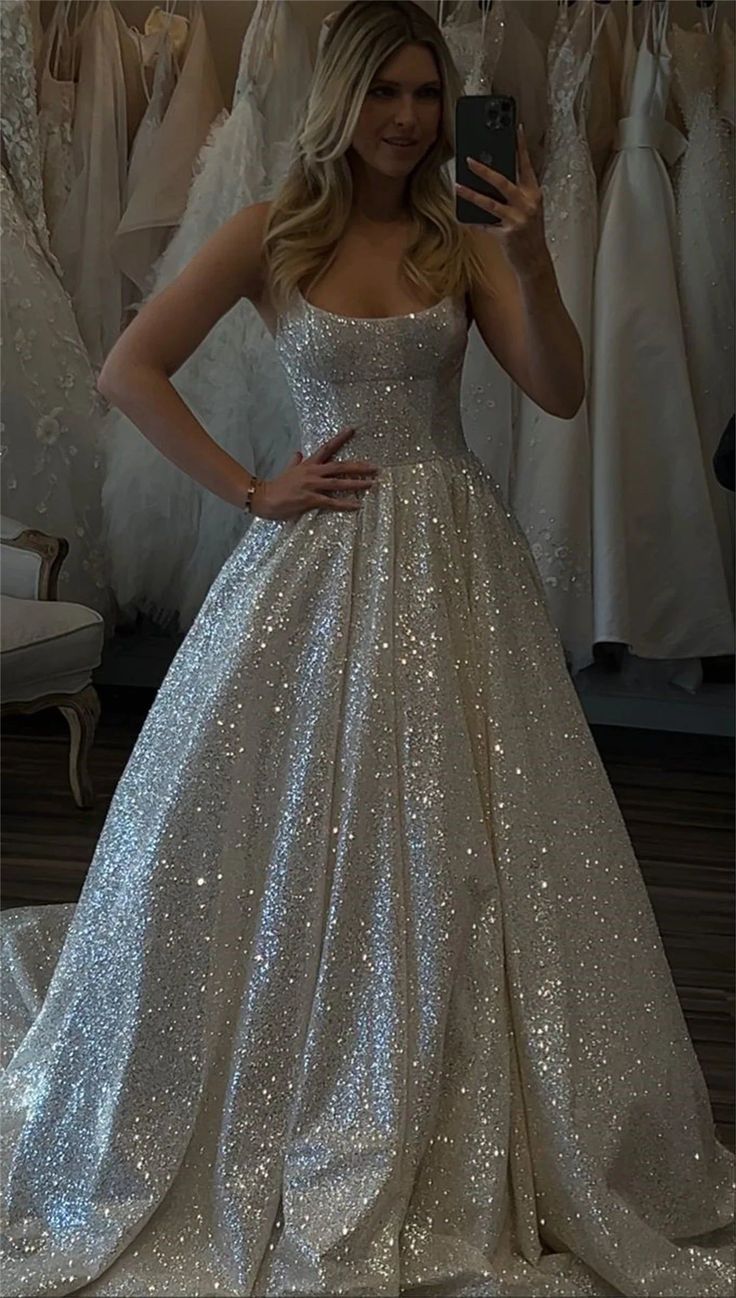 Fancy A line Spaghetti Straps White Sequin Long Prom Dresses Evening Dress HZ1024