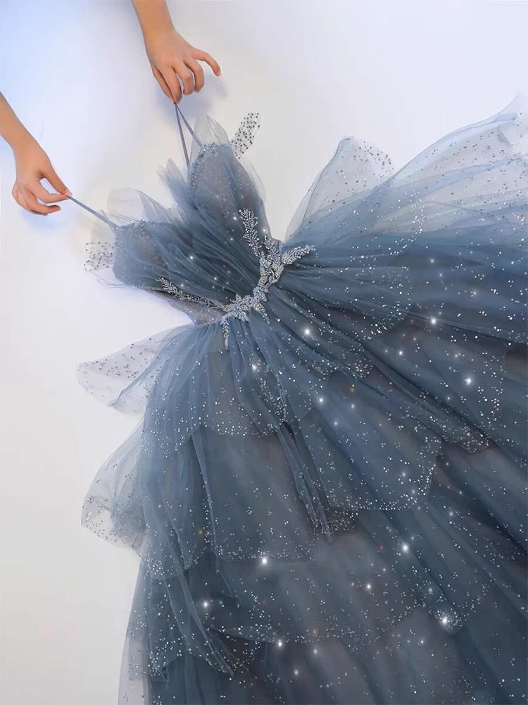 Luxury A line Spaghetti Straps Grey Blue Floor Length Prom Dresses HZ1024