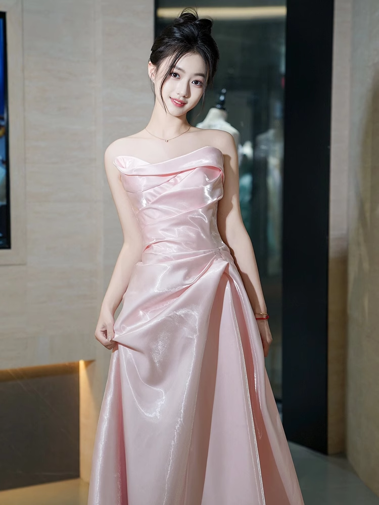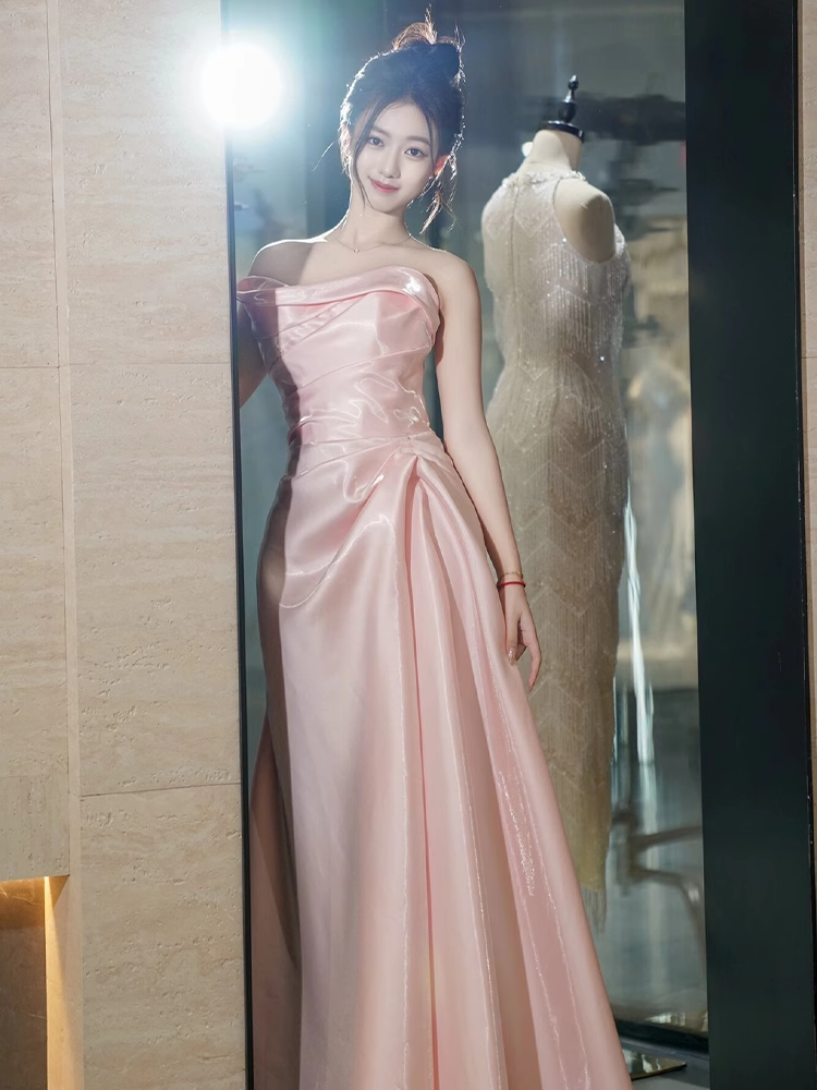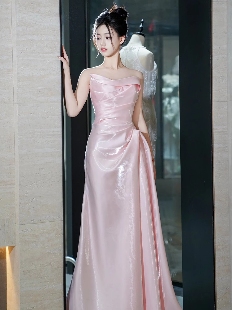 Modest Mermaid Strapless Shiny Satin Pink Long Prom Dresses HZ1024