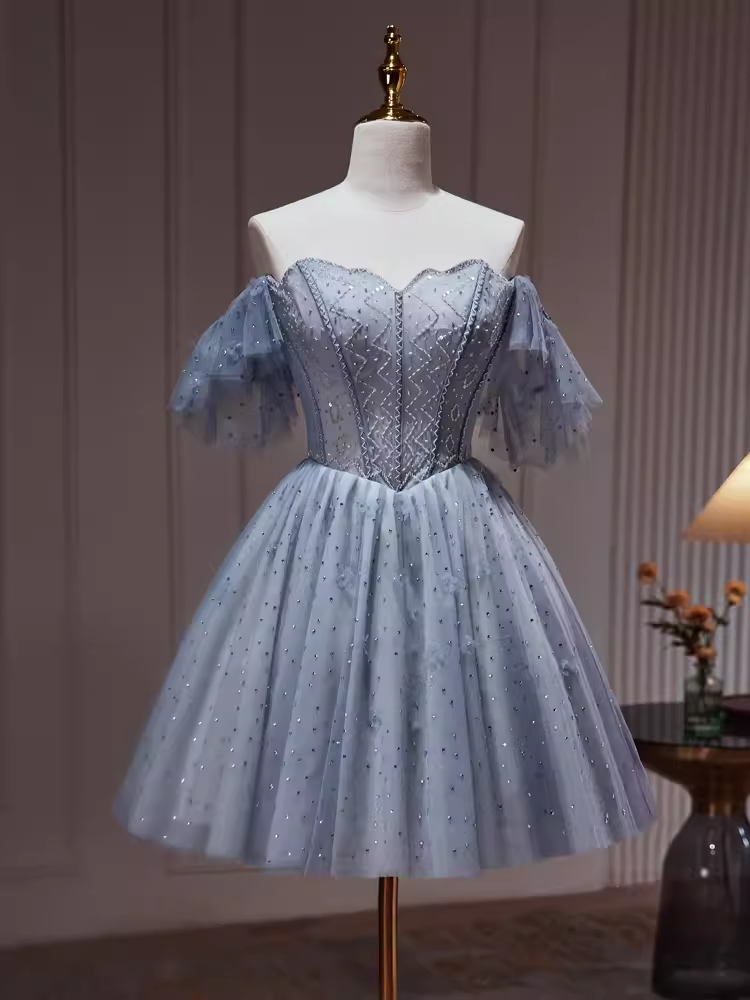 Sexy A line Off The Shoulder Tulle Gray Blue Homecoming Dresses HZ1024