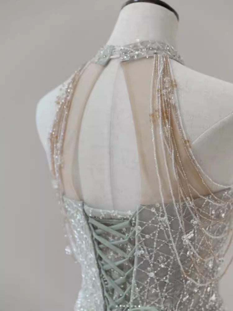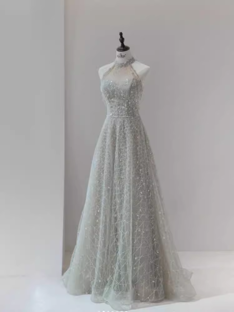 Sparkly A Line High Neckline Silver Sequin Long Prom Dress HZ1024