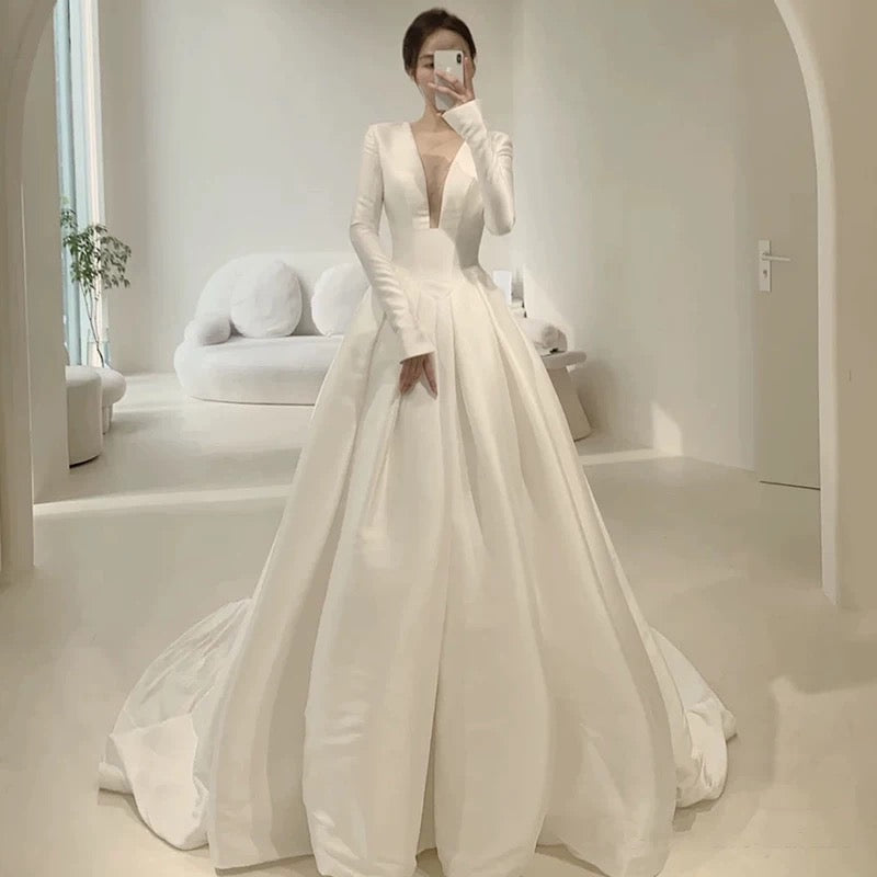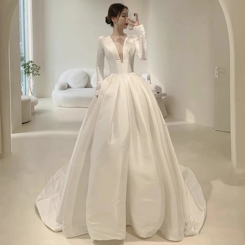 Unique A line V Neckline Long Sleeves Satin White Wedding Dresses HZ1024
