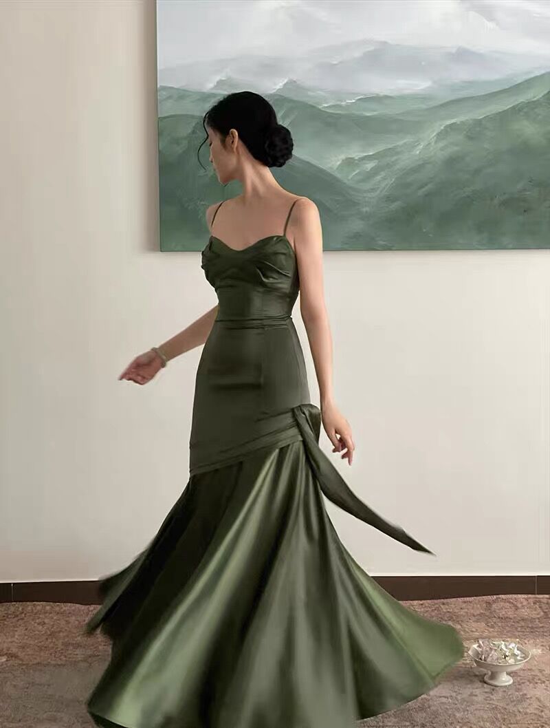 Vintage Sheath Straps Green Satin Long Prom Dresses HZ1024