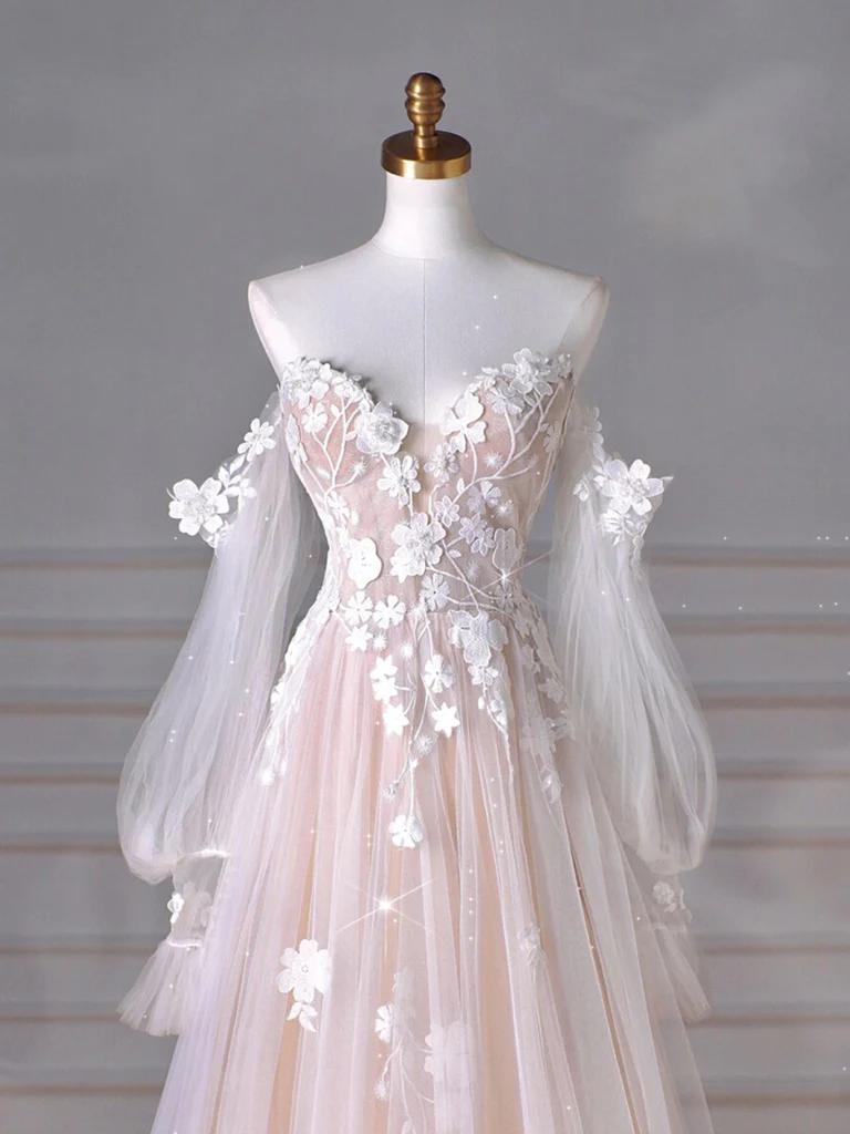 A-Line Long Sleeves Tulle Lace Champagne Long Prom Dress HZ1024