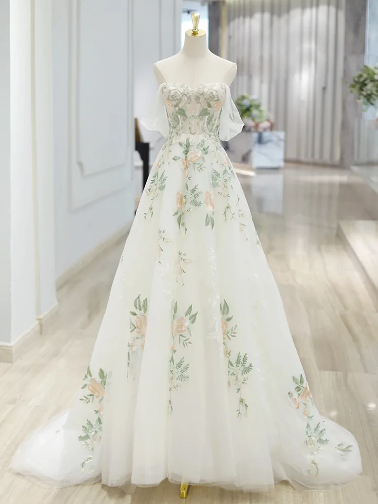 A-Line Off Shoulder Tulle Lace Applique White Long Prom Dress HZ1024
