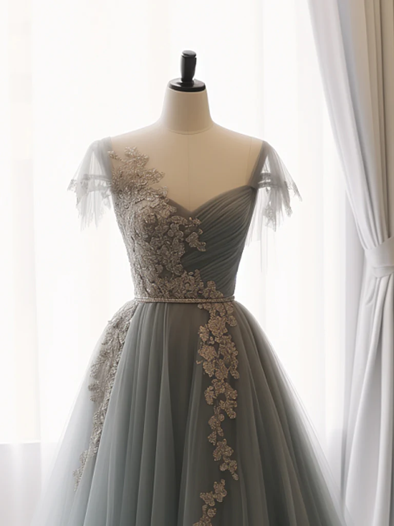 A-Line Sweetheart Neck Tulle Lace Gray Blue Long Prom Dress HZ1024