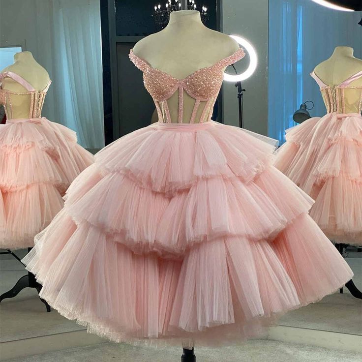 Ball Gown Puffy Straps Tiered Pink Tea Length Homecoming Dress HZ1024