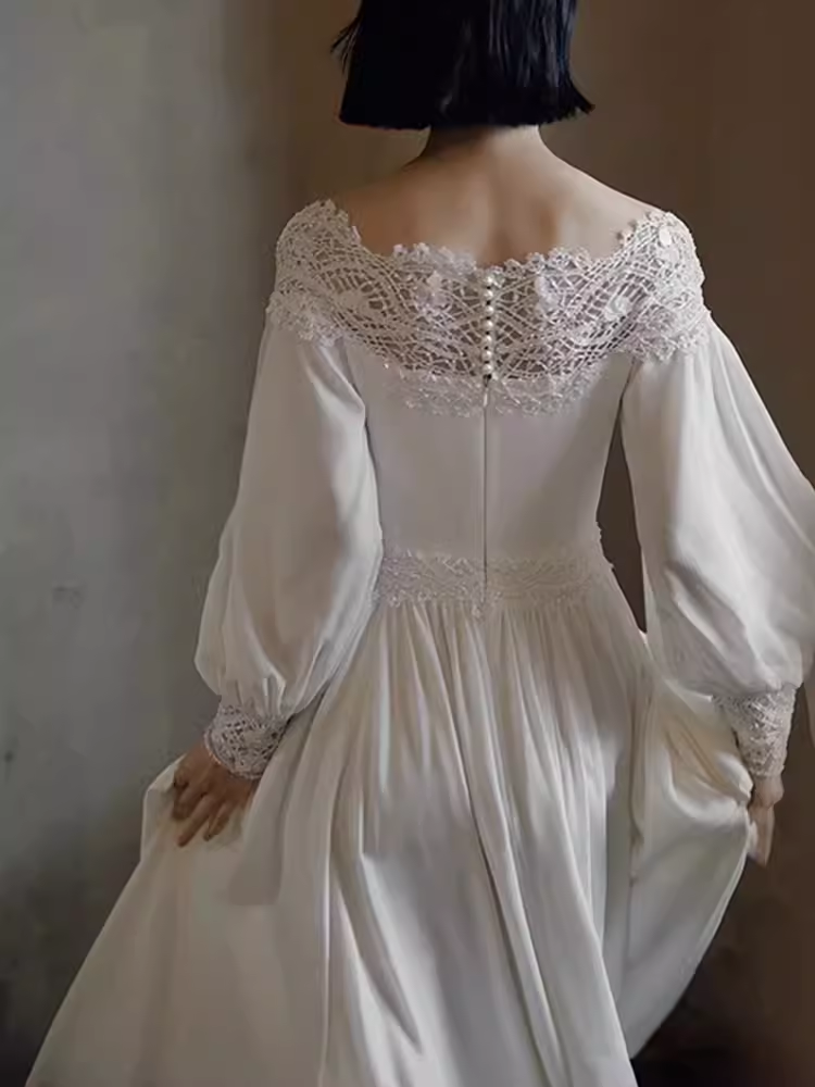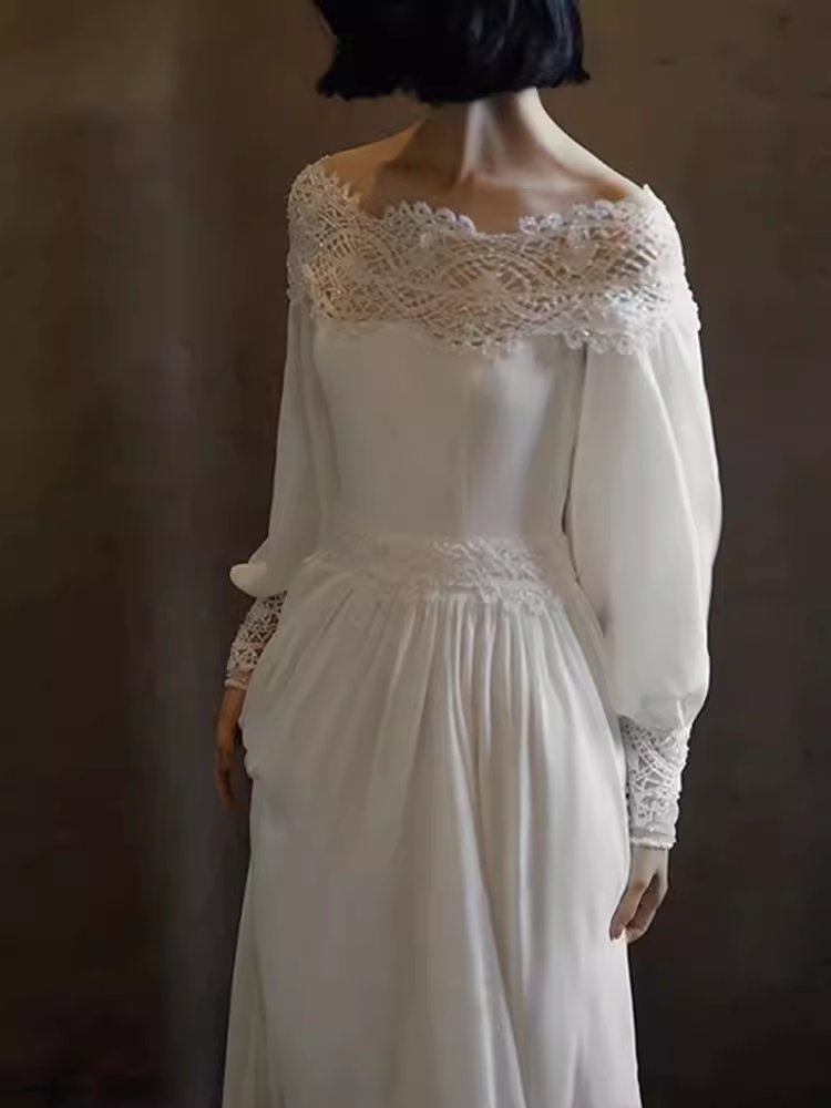 Chic A line Off The Shoulder Lace White Wedding Dress With Long Sleeves HZ1024
