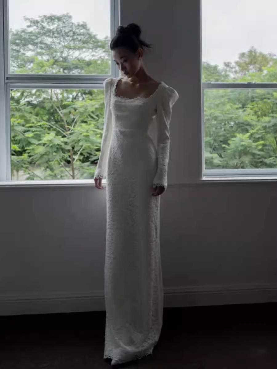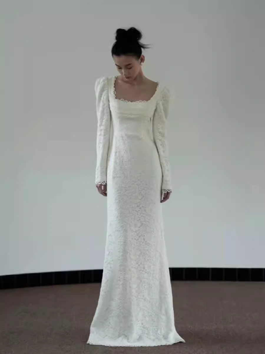 Chic Mermaid Square Neckline Long Sleeves White Lace Wedding Dresses HZ1024