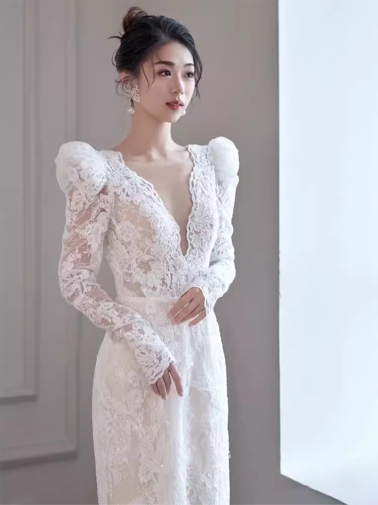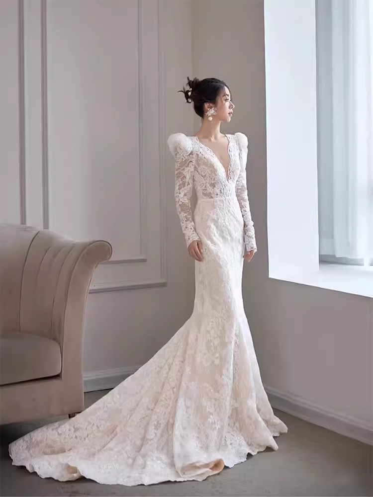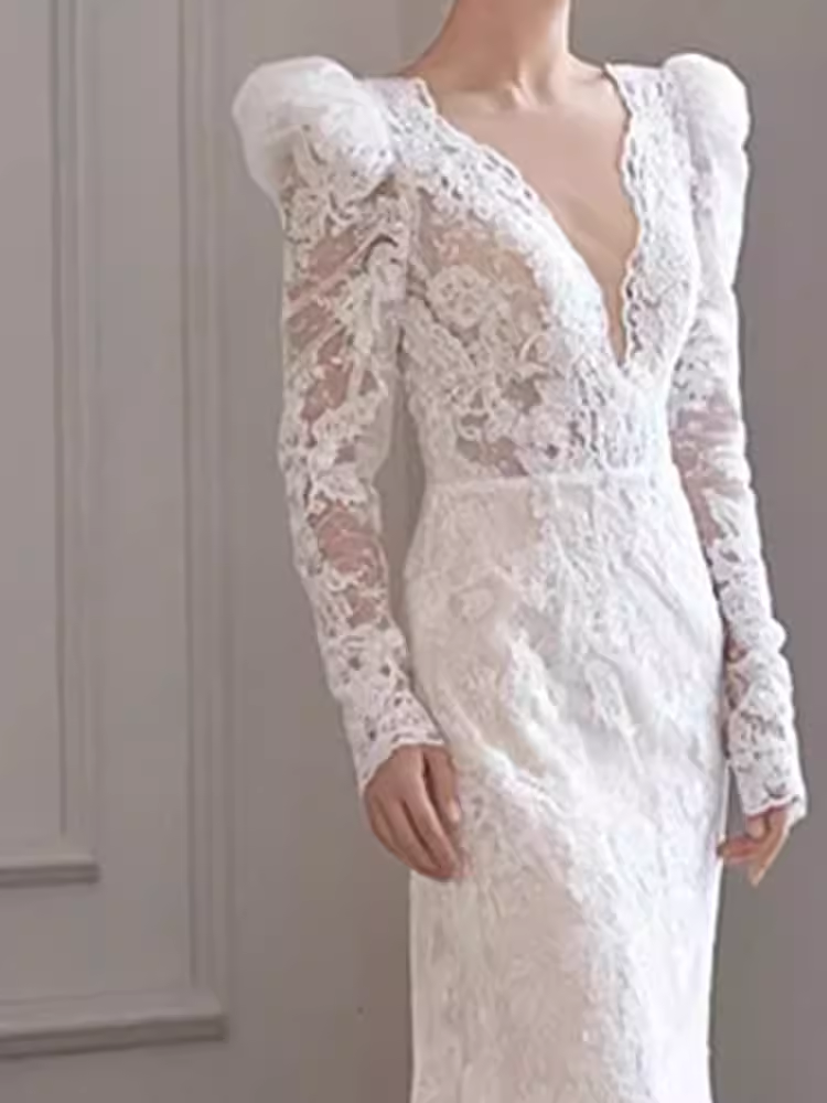 Chic Mermaid V Neckline Lace White Wedding Dress With Long Sleeves HZ1024