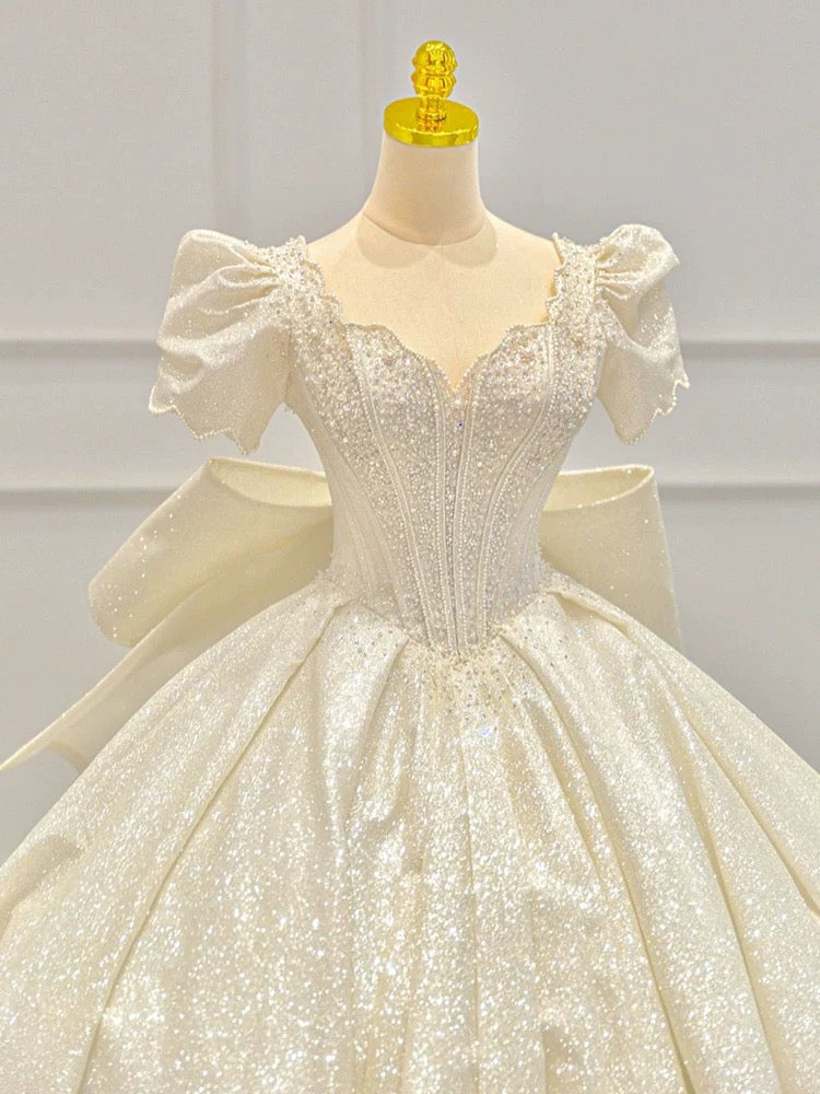 Dreamy Ball Gown Sweetheart Short Sleeves White Lace Wedding Dresses With Beads HZ1024