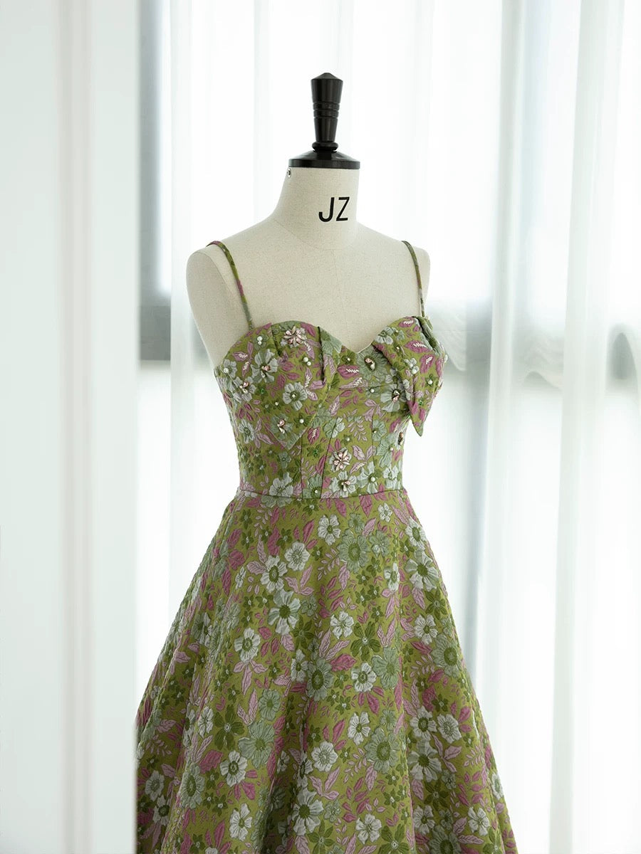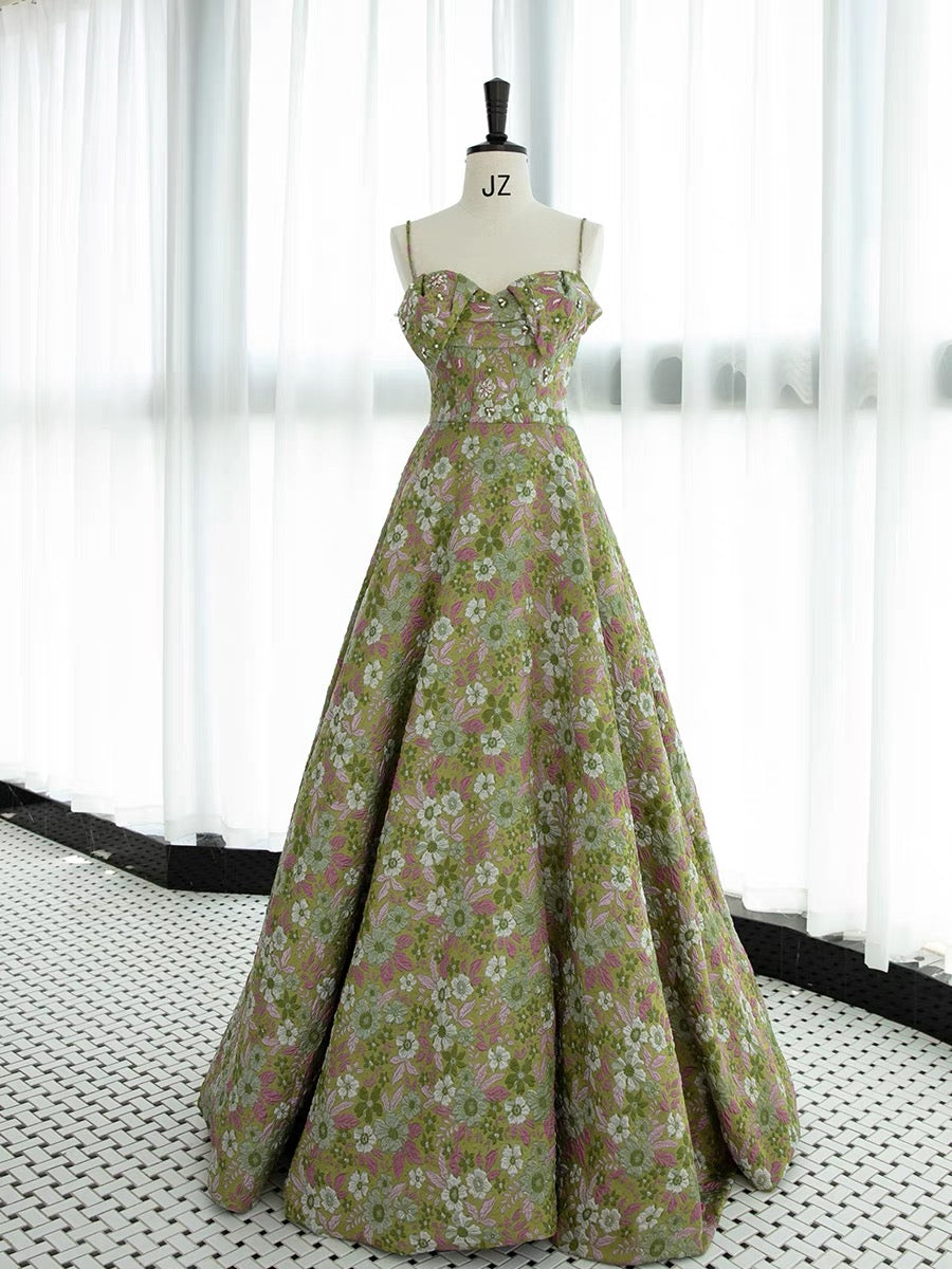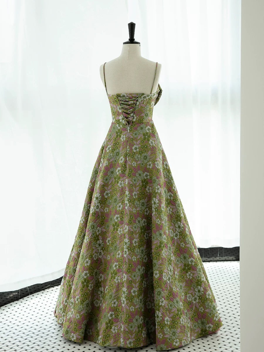 Elegant A line Spaghetti Straps Green Satin Floral Ruffles Long Prom Dress Evening Dress HZ1024