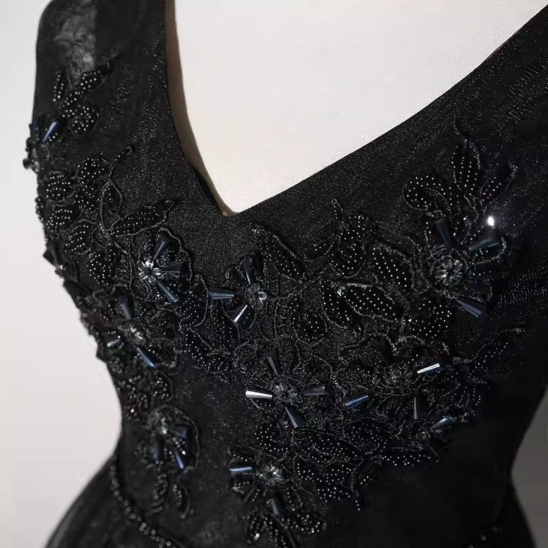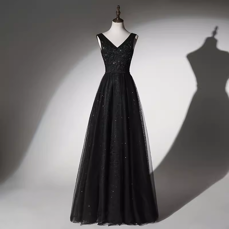Elegant A line V Neckline Tulle Long Black Prom Dress HZ1024