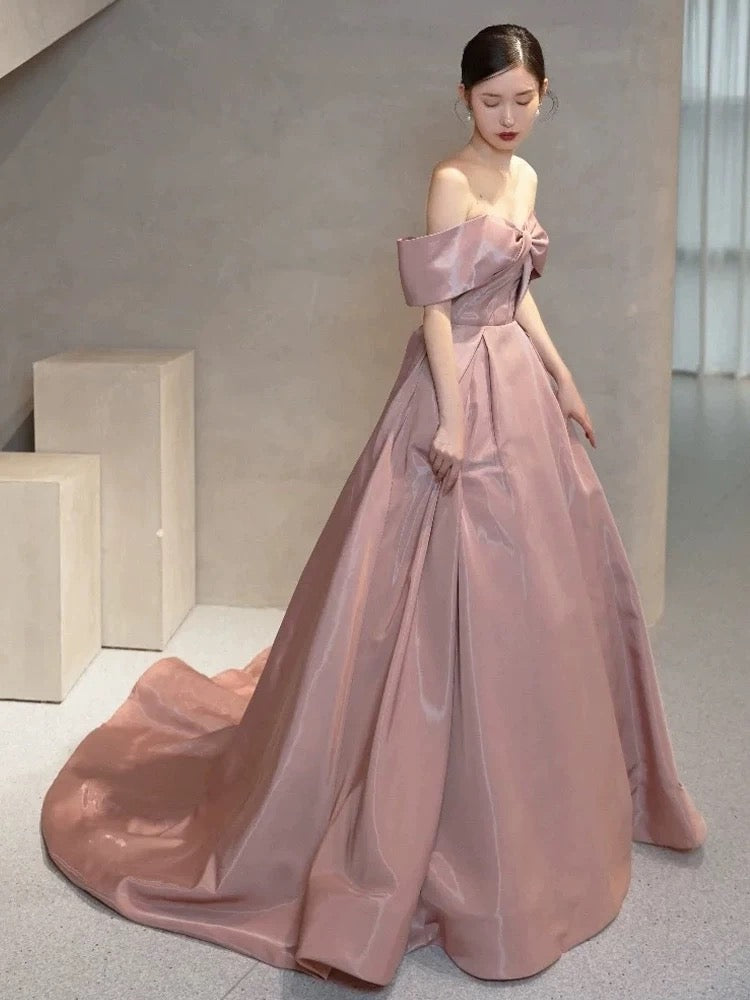 Elegant Ball Gown Off The Shoulder Satin Pink Long Prom Dresses HZ1024