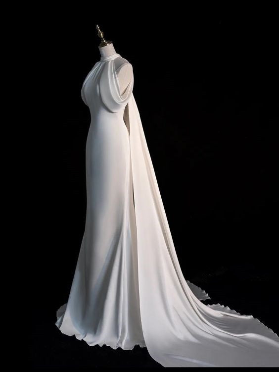 Elegant Mermaid High Neckline Satin Long White Wedding Dresses HZ1024