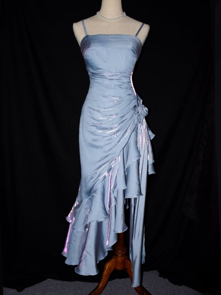 Elegant Sheath Spaghetti Straps Sky Blue Vintage Floral Dress Asymmetrical Hem Prom Dresses HZ1024