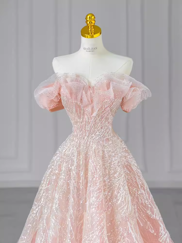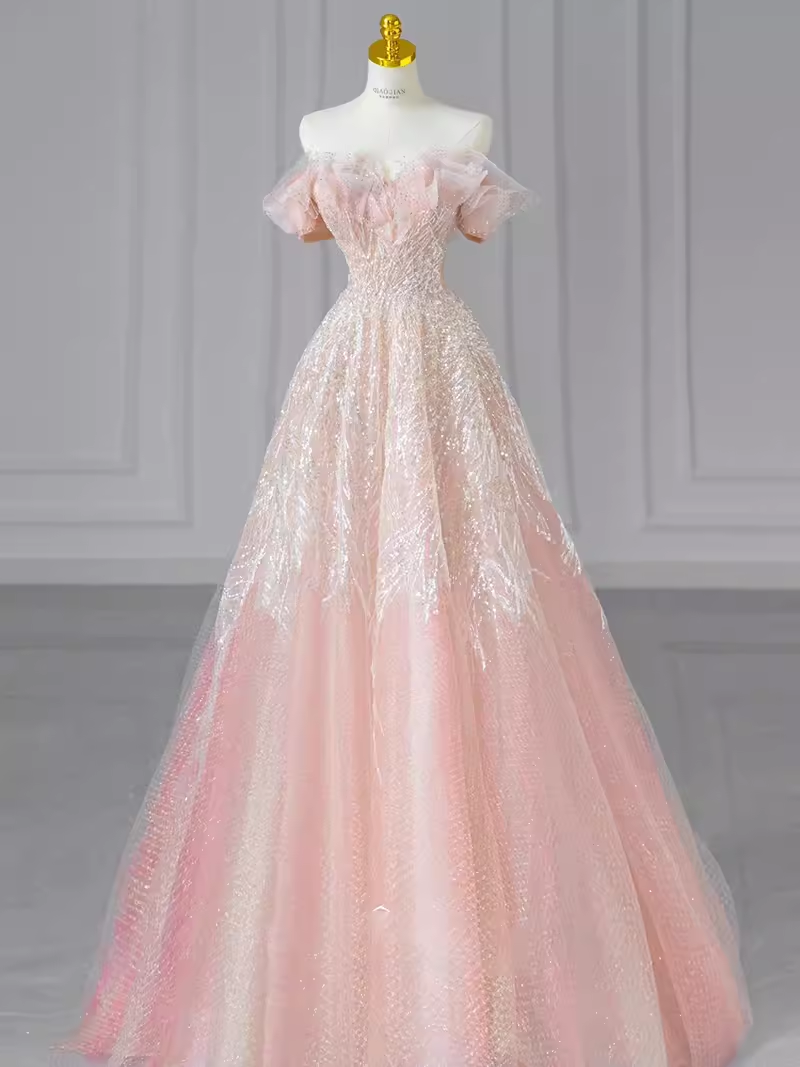 Fairytale A line Off The Shoulder Pink Sequin Beads Long Evening Dress Prom Dresses HZ1024