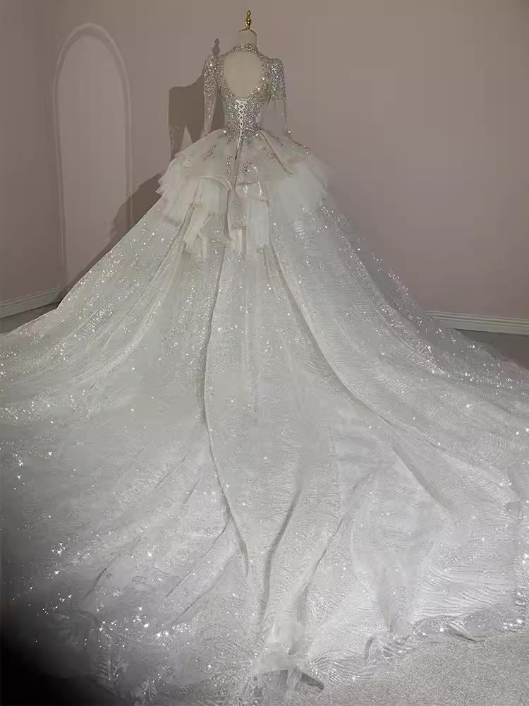 Fairytale Ball Gown High Neckline Tulle Sequin Long Wedding Dresses HZ1024