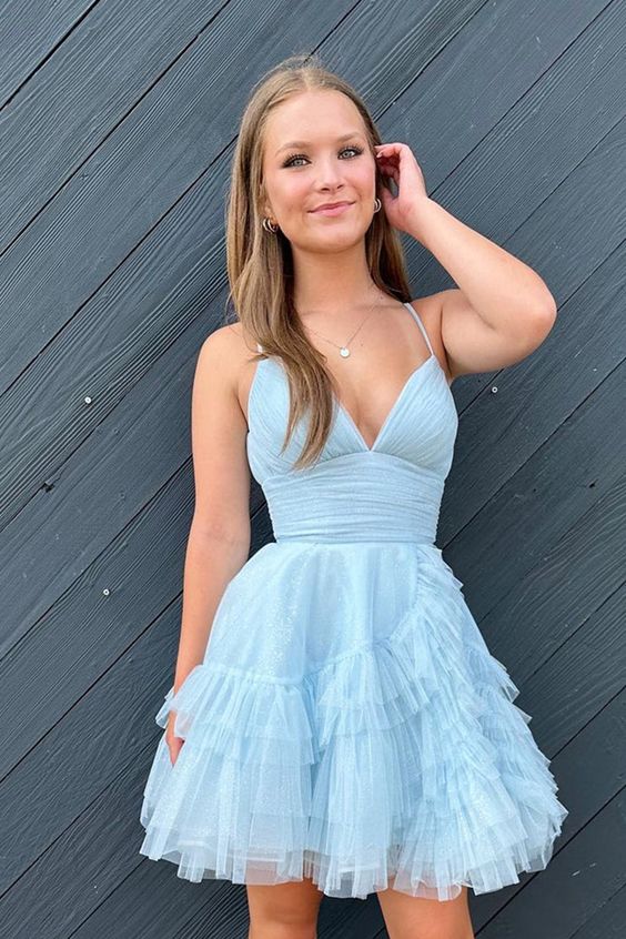 Light Blue A-line V Neck Ruffle-Layers Homecoming Dress Birthday Dress HZ1024