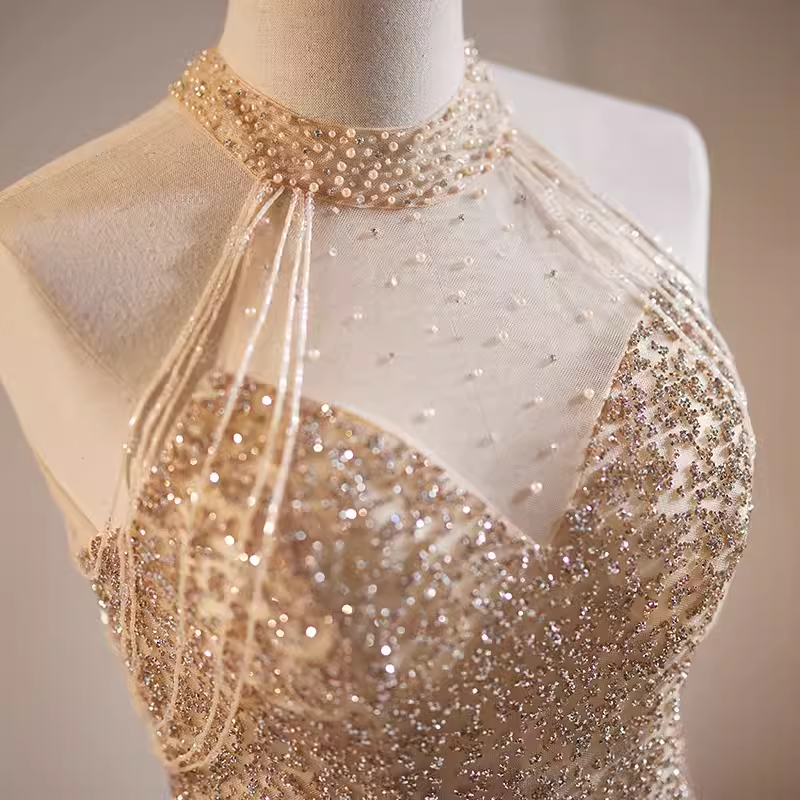 Luxury A line High Neckline Long Sequin Champagne Prom Dress HZ1024