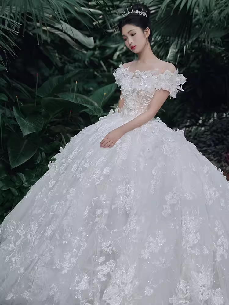 Luxury Ball Gown Off The Shoulder Short Sleeves White Lace Wedding Dress HZ1024