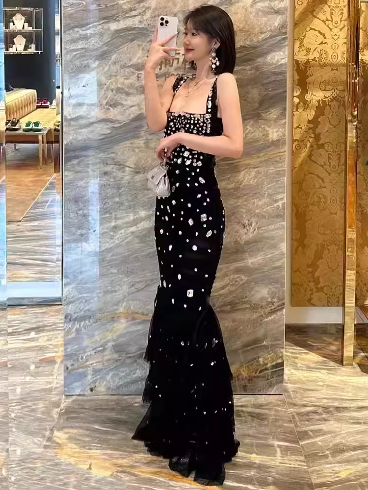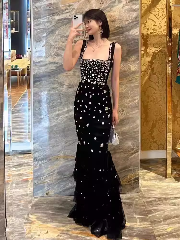 Mermaid Straps Black Tulle Beads Long Prom Dress HZ1024