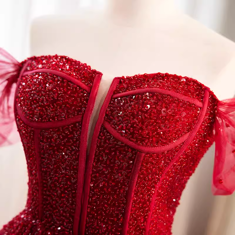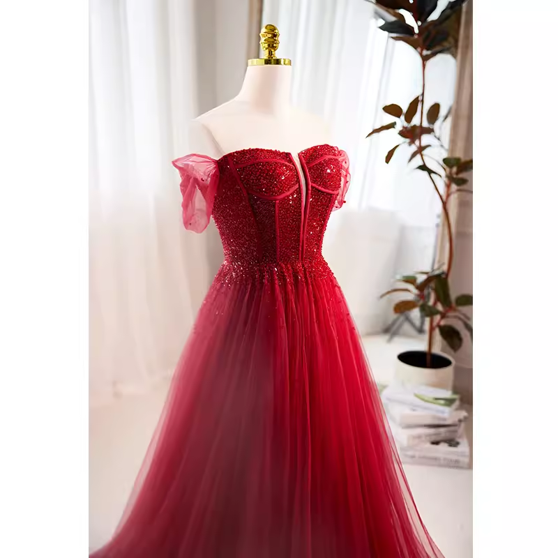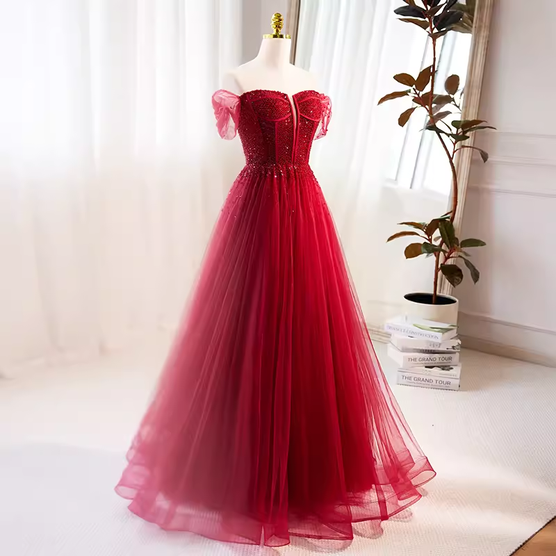 Modest A line Off The Shoulder Tulle Long Red Prom Dress HZ1024