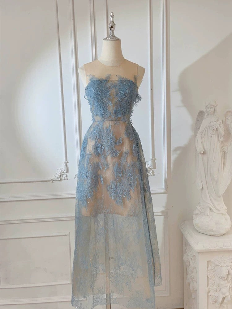 Modest A line Scoop Neckline Lace Blue Prom Dress Evening Dresses HZ1024