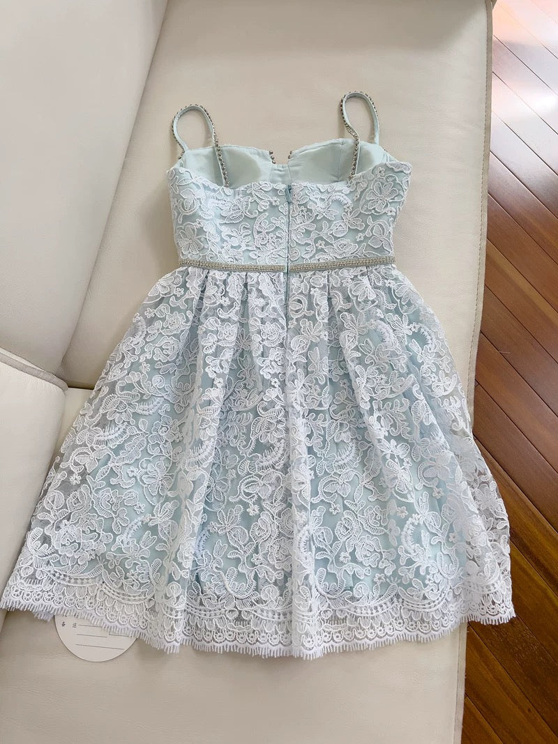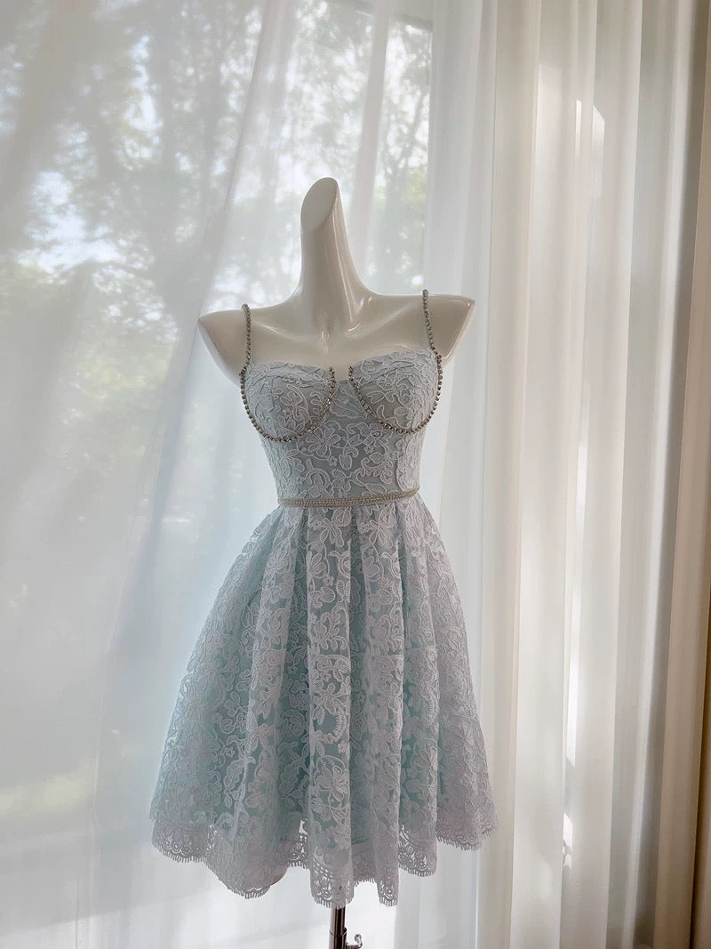 Modest A line Spaghetti Straps Light Skye Blue Lace Short Homecoming Dresses Birthday Outfit HZ1024