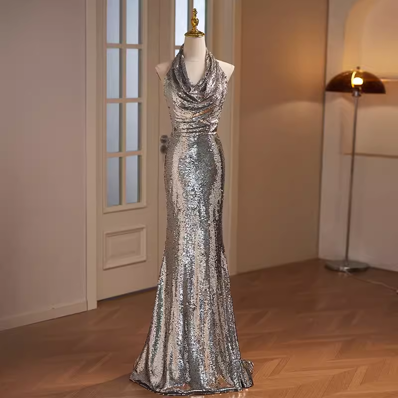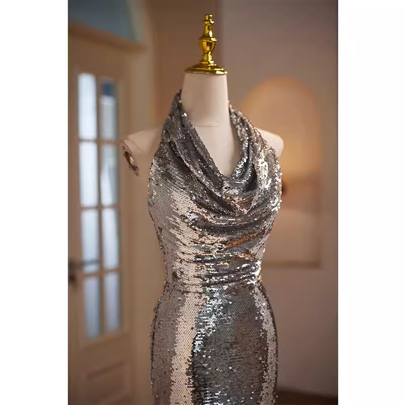 Modest Mermaid Halter Sequin Long Silver Prom Dress HZ1024