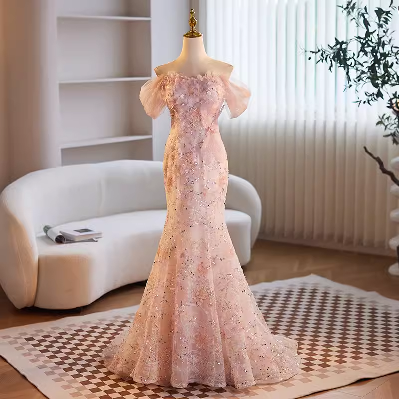 Modest Mermaid Off The Shoulder Long Pink Prom Dress HZ1024