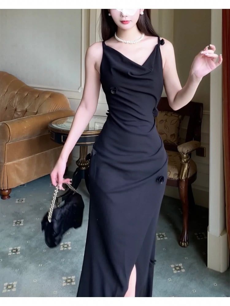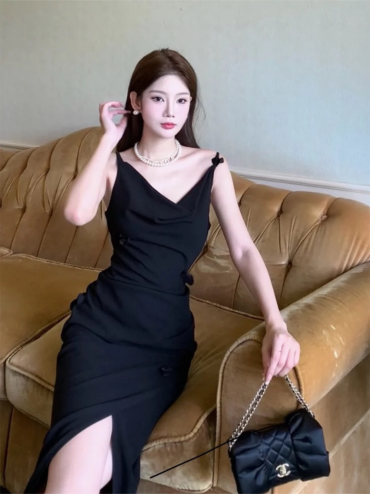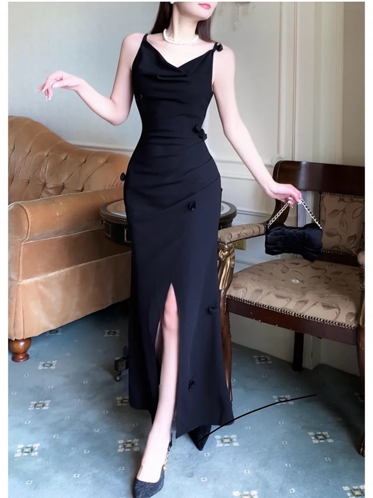 Modest Sheath Spaghetti Straps Long Black Slit Prom Dress Evening Dresses HZ1024