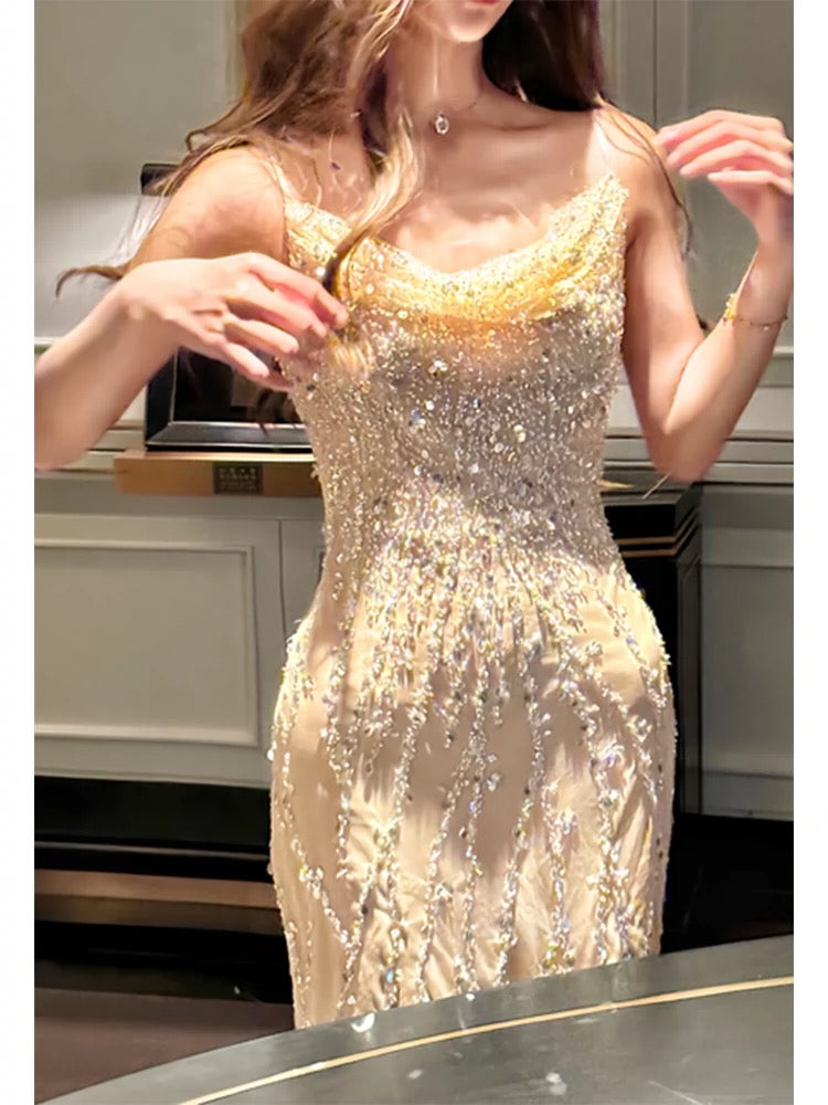 Modest Sheath Spaghetti Straps Sequin Long Champagne Prom Dress Evening Dresses HZ1024
