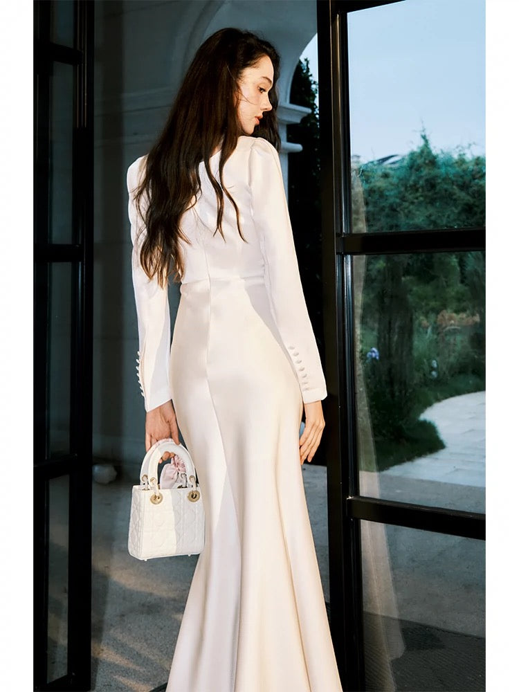 Modest Sheath Square Neckline White Long Prom Dresses Slit Evening Dress HZ1024