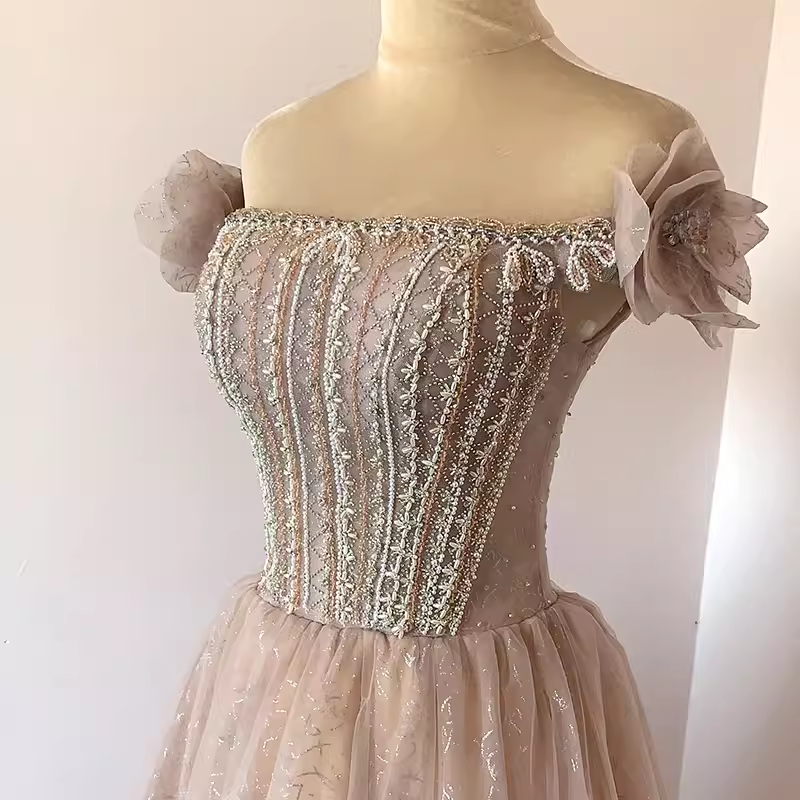 Pretty A Line Off The Shoulder Beads Tulle Sequin Long Prom Dresses HZ1024