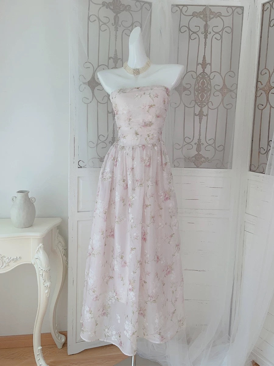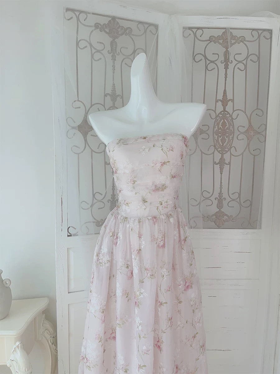 Pretty A Line Strapless Floral Pink Chiffon Prom Dresses Sexy Evening Dress HZ1024