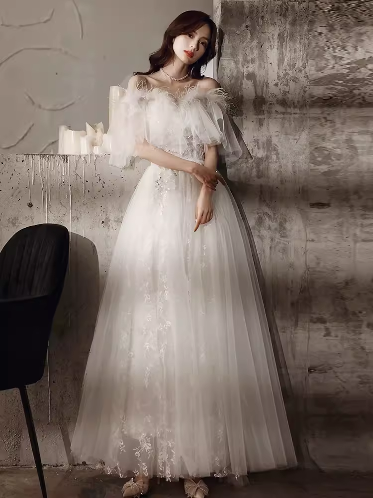 Princess A Line Off The Shoulder Tulle White Long Wedding Dresses HZ1024