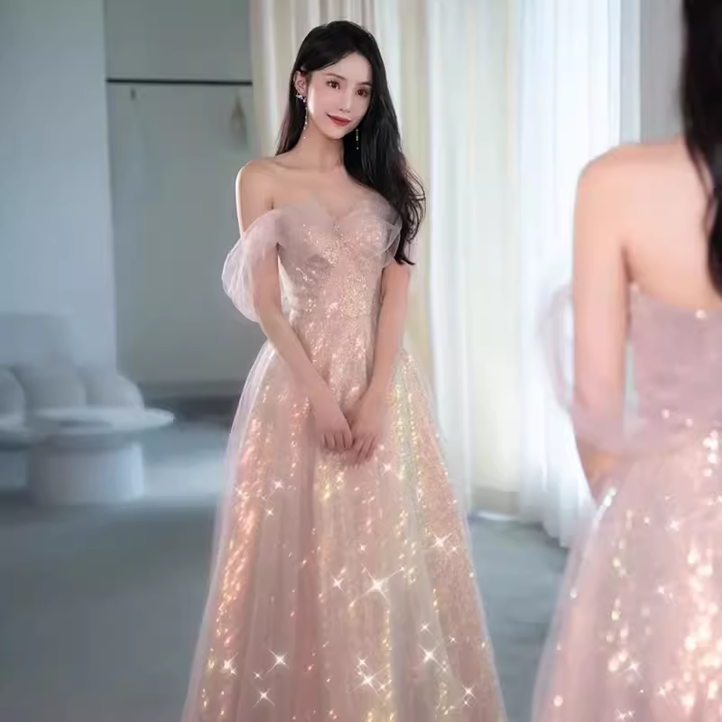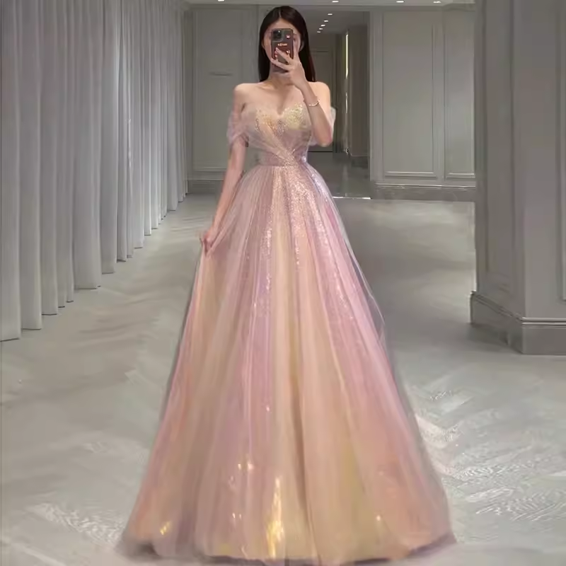 Sexy A Line Off The Shoulder Pink Tulle Long Prom Dresses HZ1024