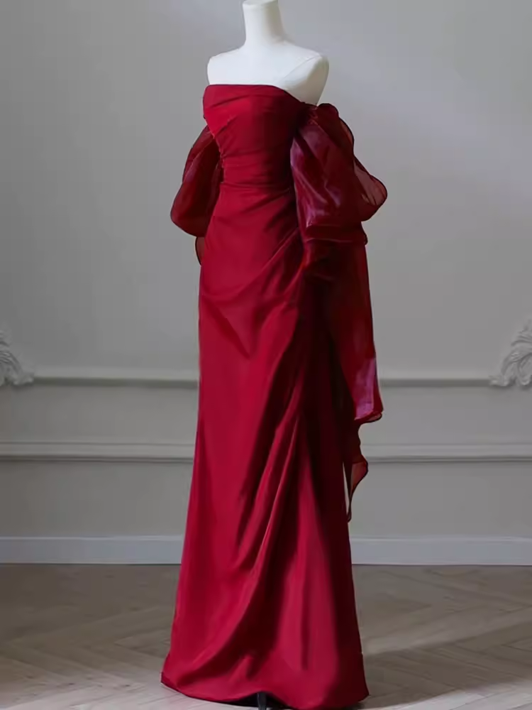 Sexy Mermaid Off The Shoulder Short Sleeves Satin Burgundy Prom Dress HZ1024
