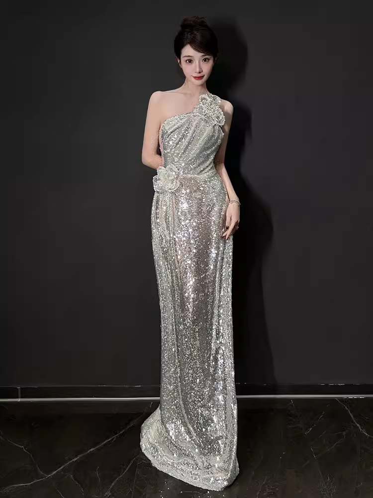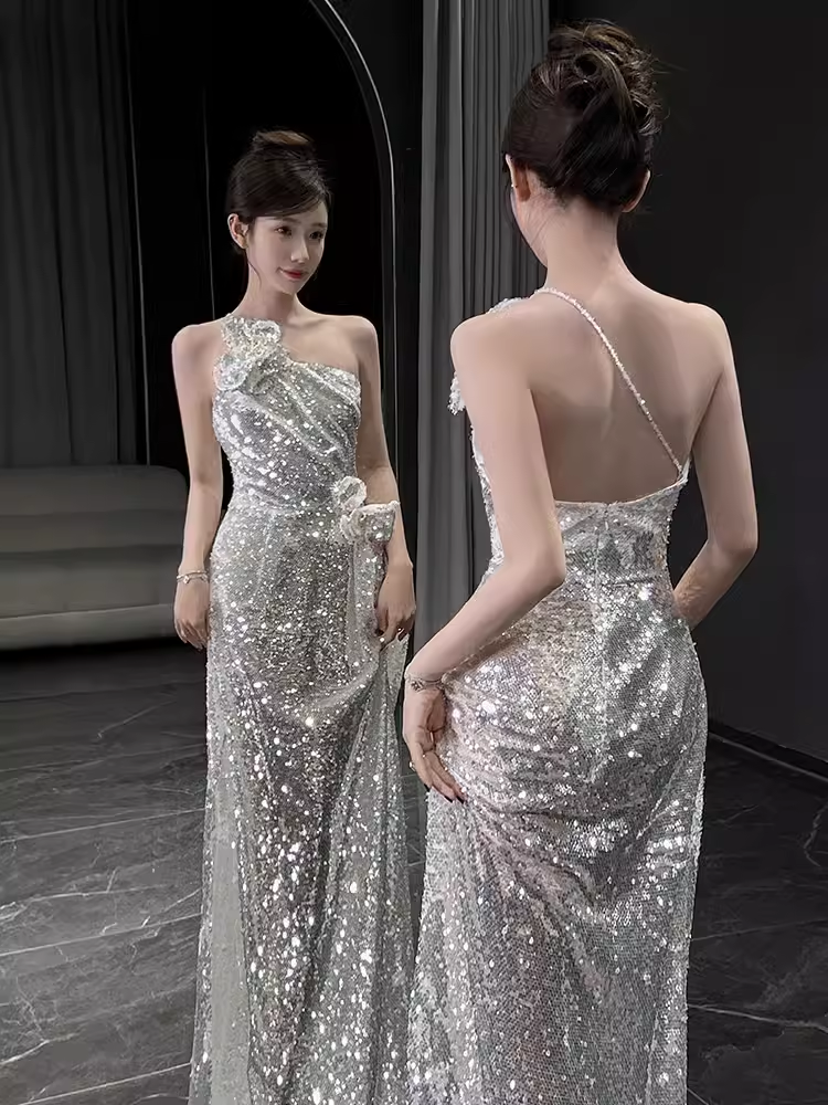 Sexy Mermaid One Shoulder Silver Sequin Long Prom Dress HZ1024