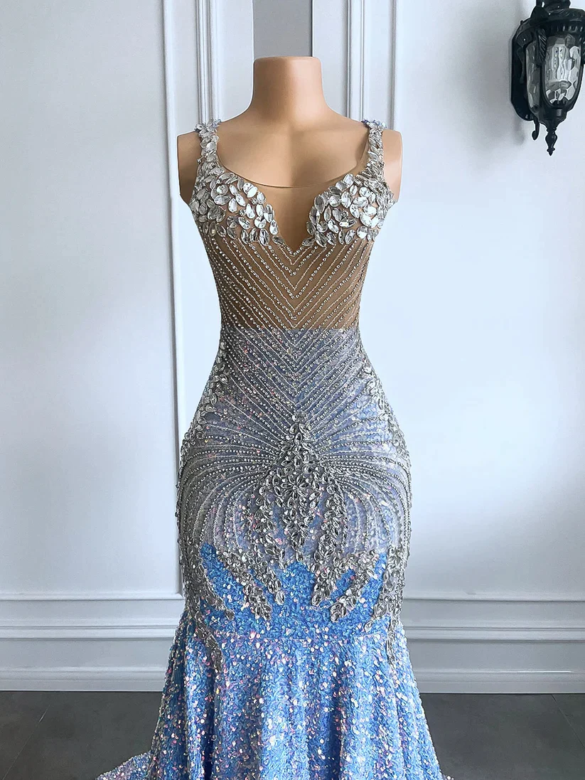 Sexy Mermaid Straps Beads Sequin Long Prom Dress HZ1024