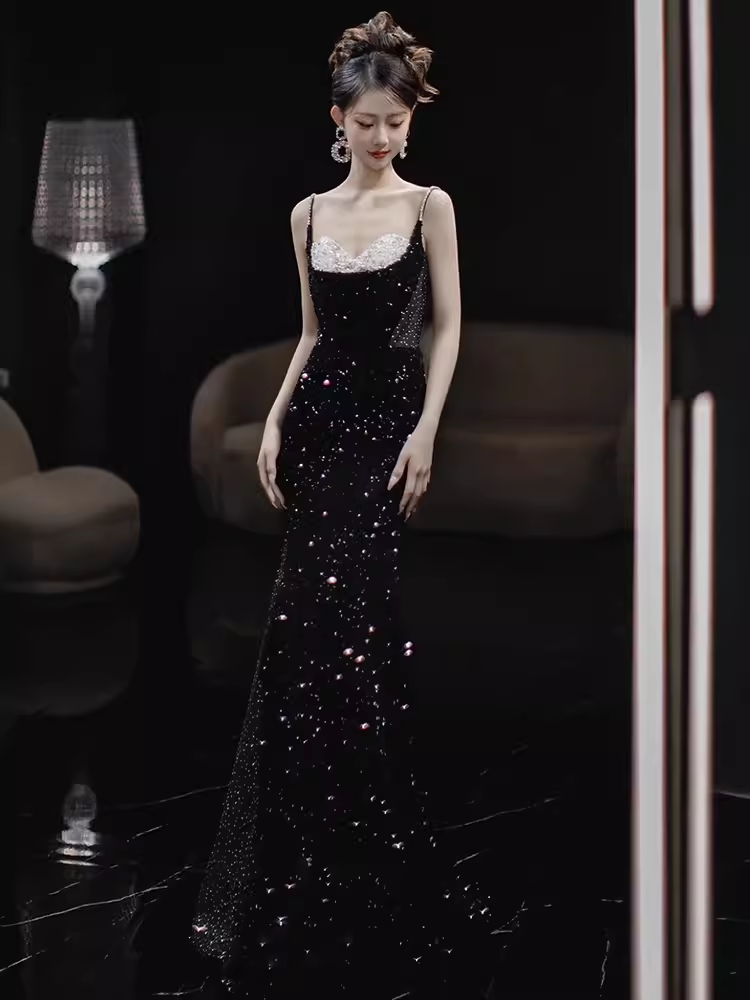 Sexy Mermaid Straps Sequin Long Black Prom Dress HZ1024