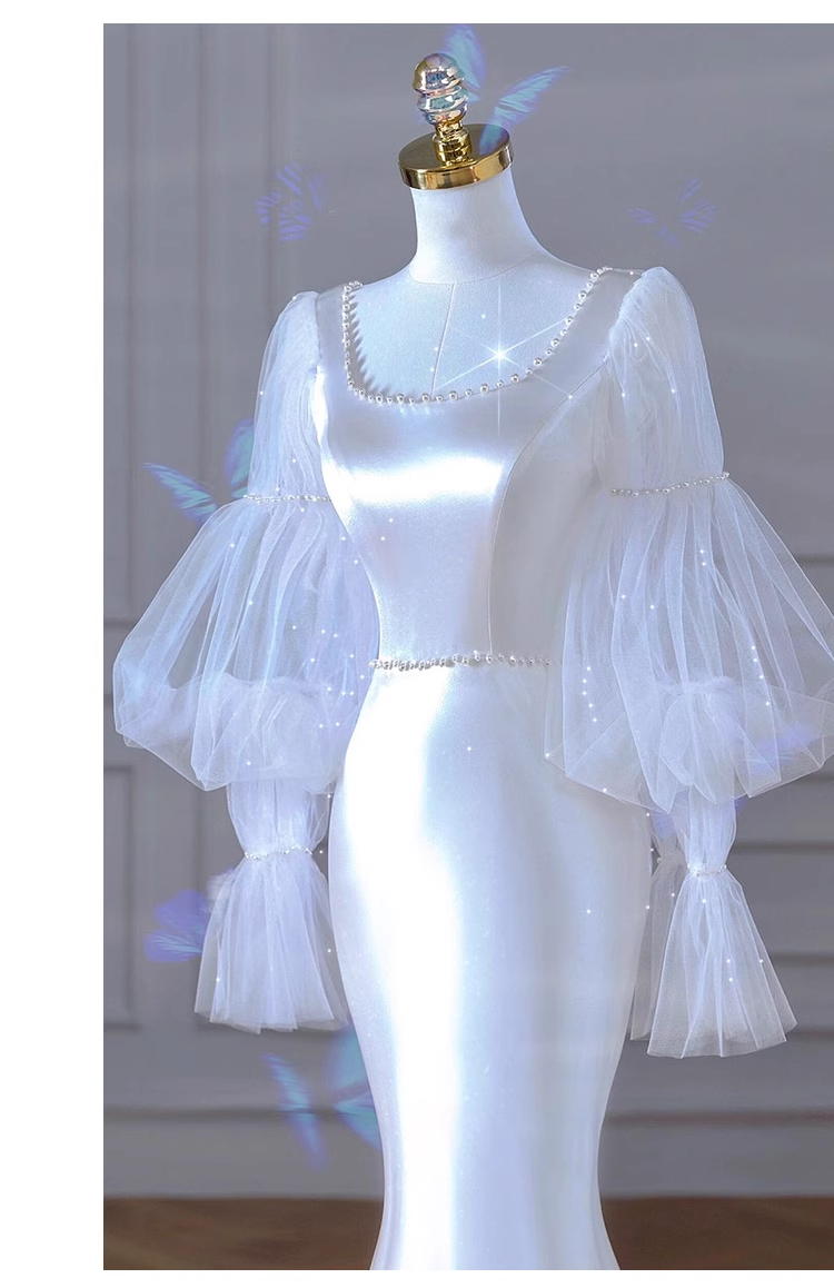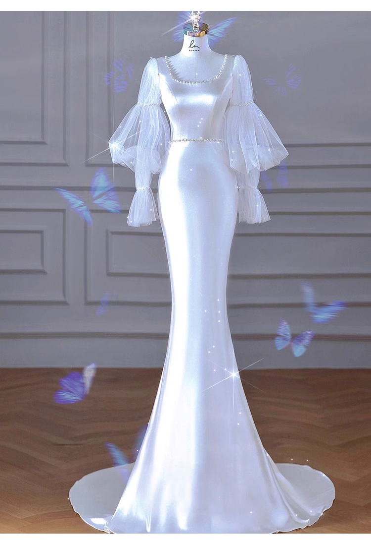 Sexy Mermaid U Neckline Long Sleeves Satin Long Wedding Dresses With Pearls HZ1024