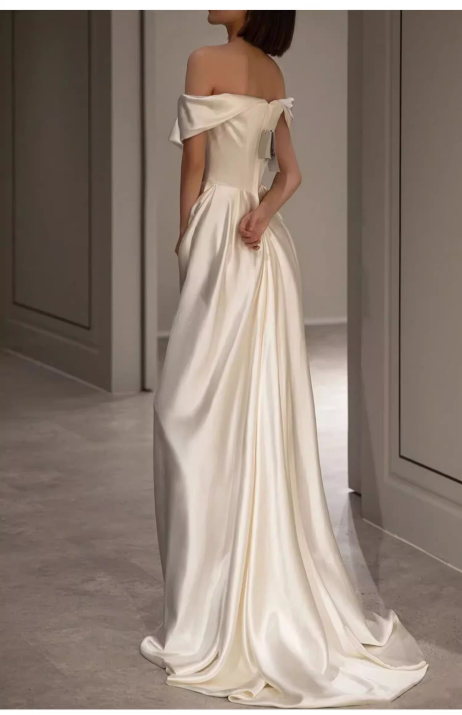 Sexy Sheath Off The Shoulder Short Sleeves Satin Long Wedding Dresses With Ruffles HZ1024