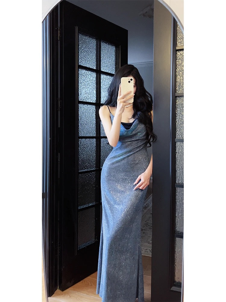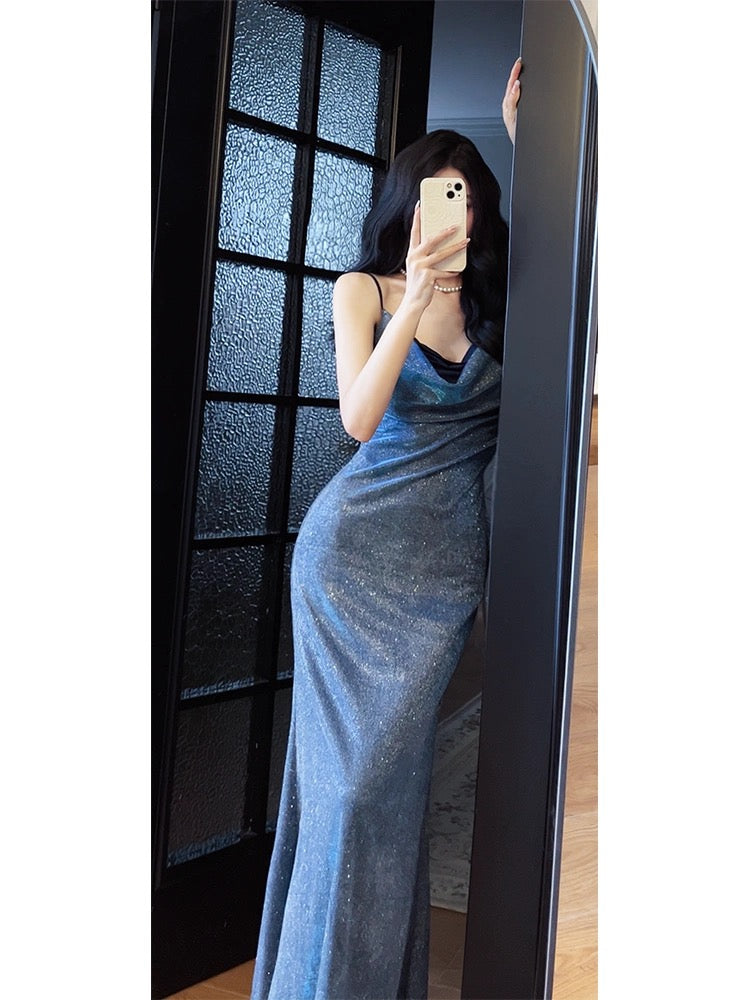 Sexy Sheath Spaghetti Straps Sleeveless Navy Blue Sequin Prom Dresses Evening Gowns HZ1024