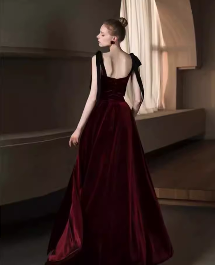 Simple A Line Burgundy Velvet Long Prom Dresses HZ1024